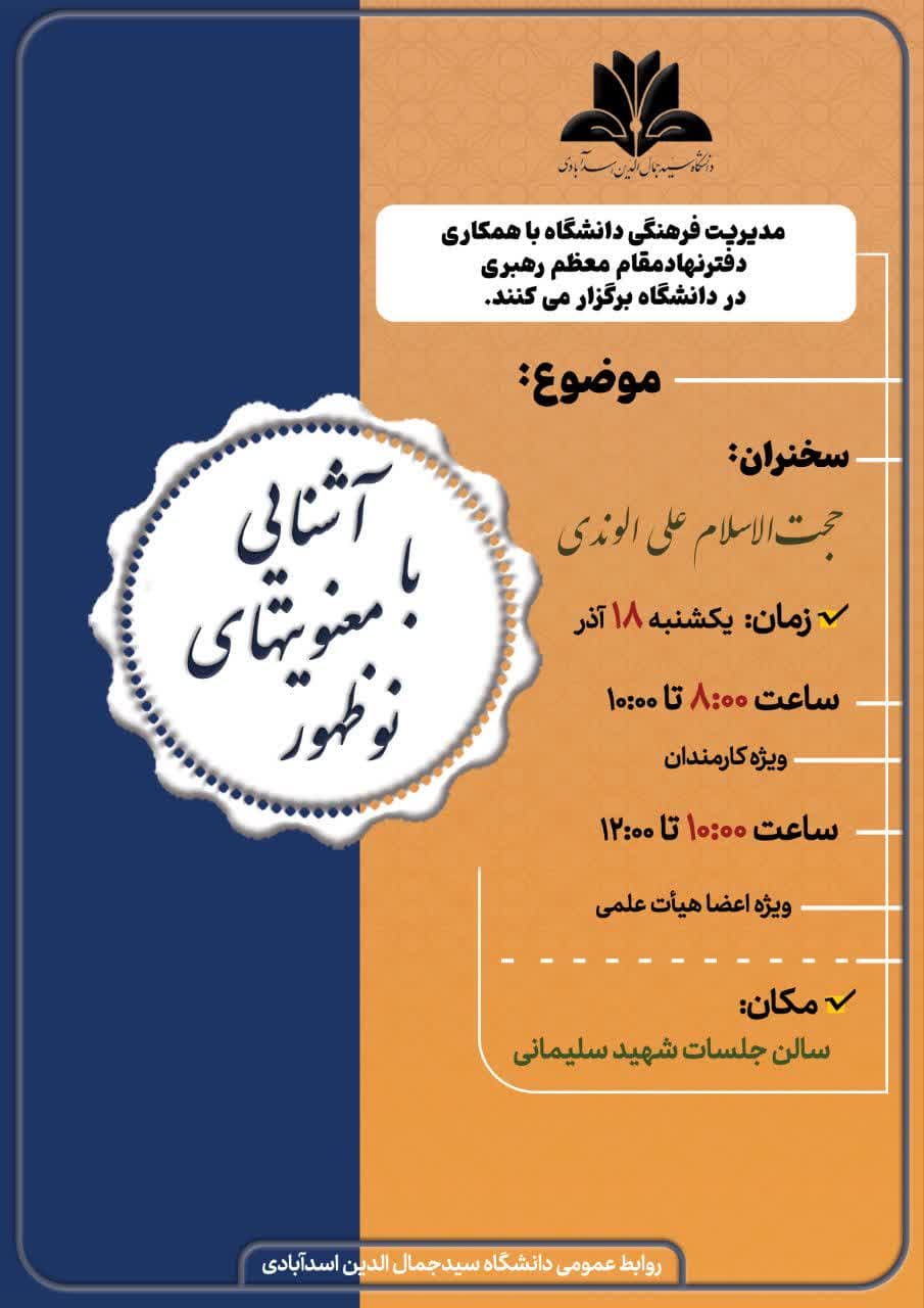 کرسی آزاد اندیشی با عنوان آشنایی با معنویت های نوظهور در مورخ در ۱۸ آذر ماه ۱۴۰۳ در سالن جلسات شهید سلیمانی برگزار گردید. در این نشست که با موضوع آگاهی بخشی نسبت به عرفان های نوظهور و کاذب در سراسر کشور و خصوصا استان همدان و شهرستان اسدآباد مورد بحث و گفت و گو قرار گرقت.
