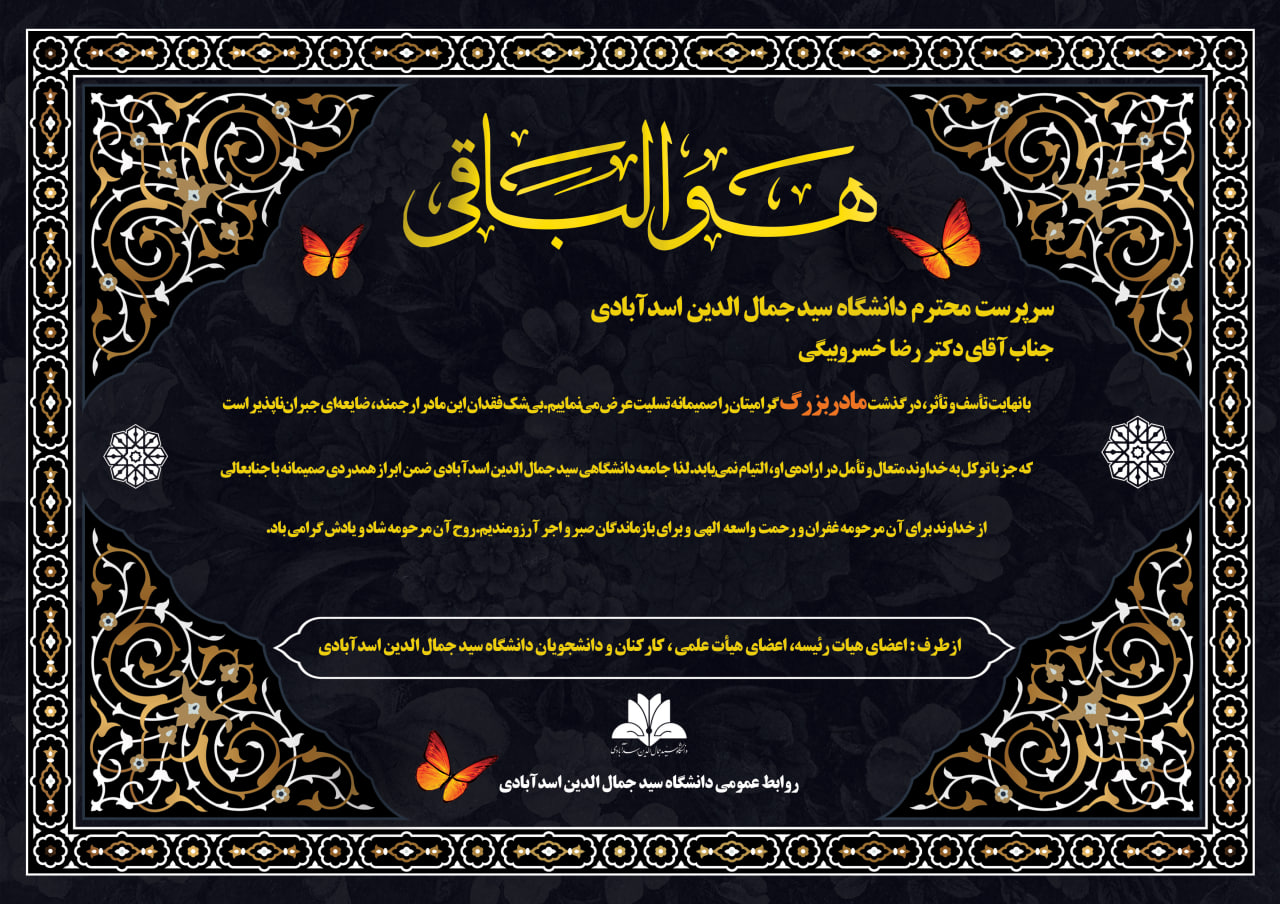 لذا جامعه دانشگاهی سید جمال الدین اسدآبادی ضمن ابراز همدردی صمیمانه با جنابعالی از خداوند برای آن مرحومه غفران و رحمت واسعه الهی و برای بازماندگان صبر و اجر آرزومندیم.روح آن مرحومه شاد و یادش گرامی باد.