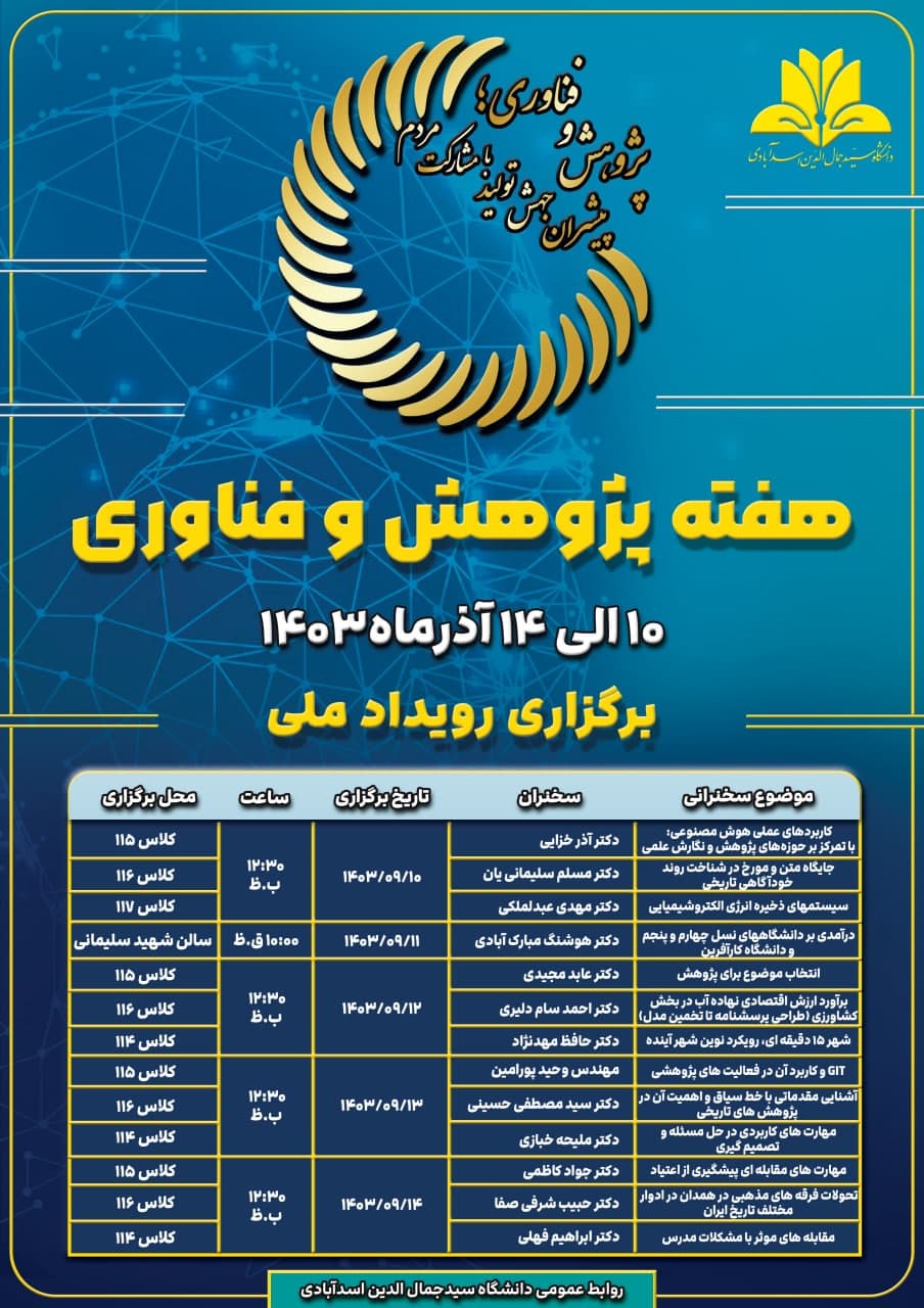 به گزارش روابط عمومی و پایگاه اطلاع رسانی دانشگاه، زمان کارگاه های بزرگداشت هفتۀ پژوهش در دانشگاه سیدجمال الدین اسدآبادی اعلام گردید.