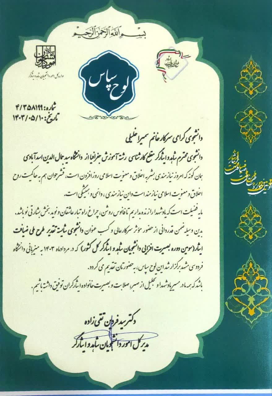 ضمناً یادآور می شود "سرکار خانم سمیرا خلیلی" از دانشجویان شاهد و ایثارگر دانشگاه در طرح ملی ضیافت ایثار به عنوان "دانشجوی شایسته تقدیر" انتخاب شدند.