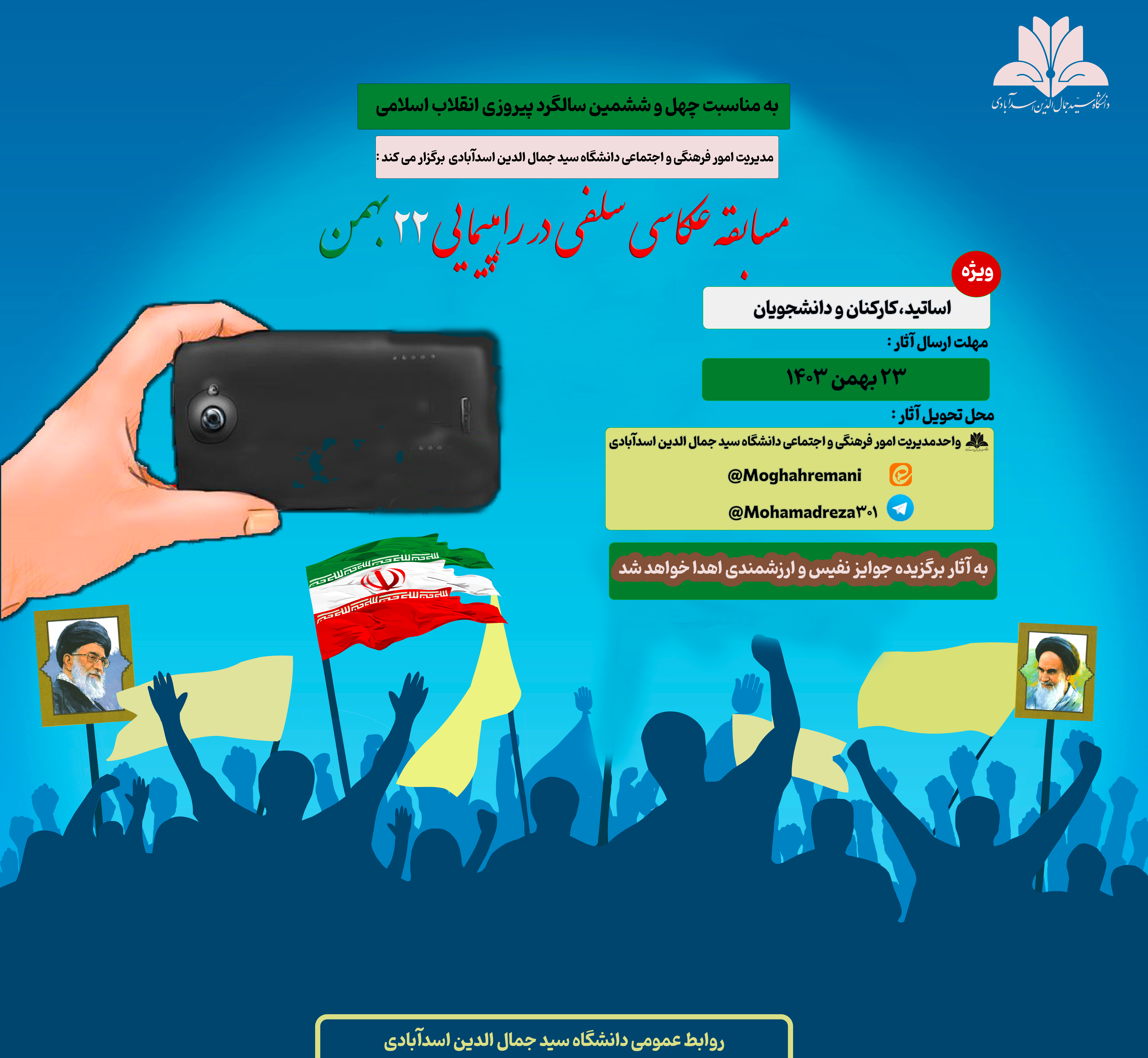 مدیریت امور فرهنگی و اجتماعی دانشگاه سید جمال الدین اسدآبادی، به مناسبت چهل و ششمین سالگرد پیروزی انقلاب اسلامی برگزار می کند: - دانشگاه سید جمال الدین اسدآبادی