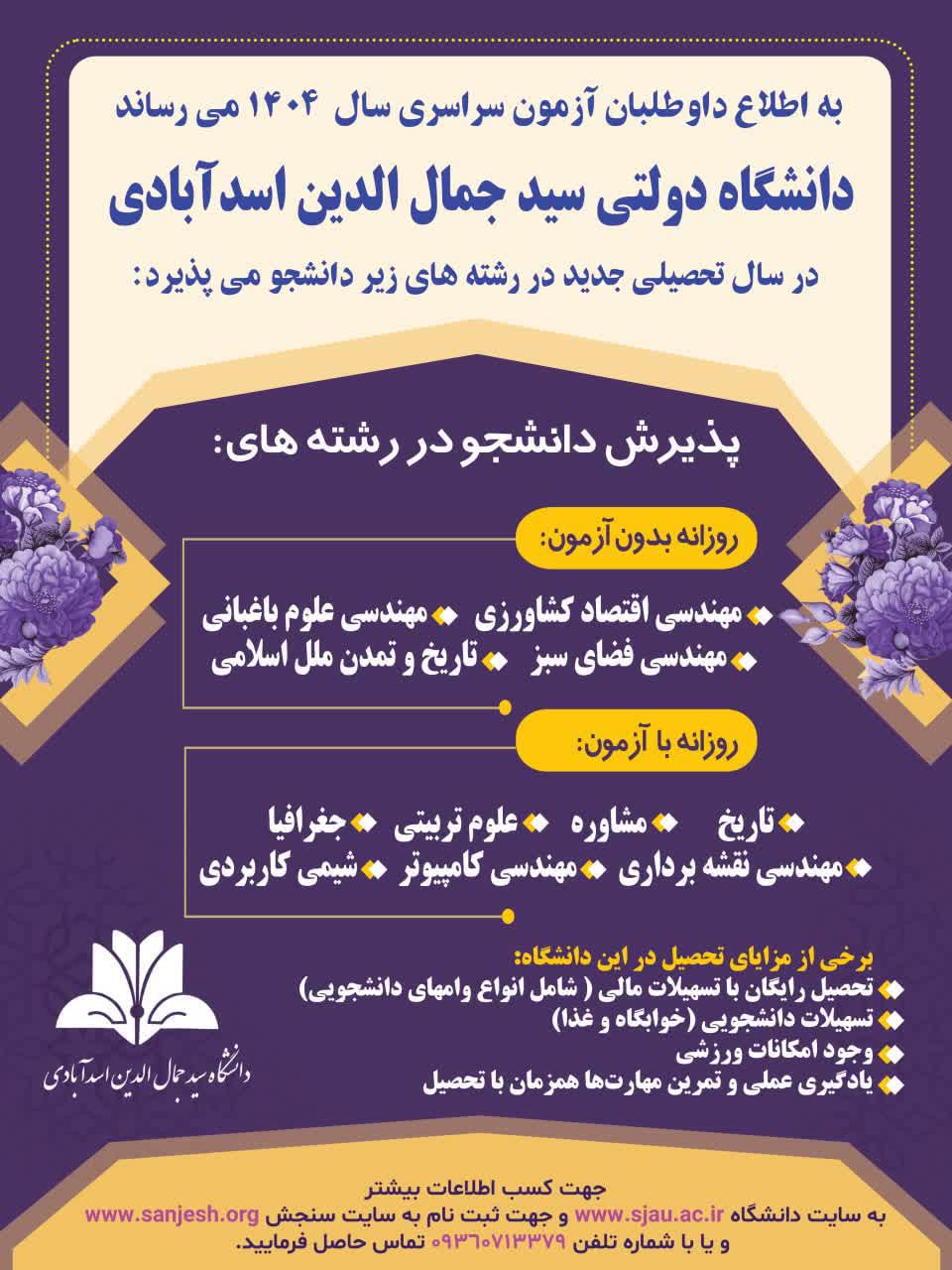 اطلاعیه پذیرش بدون آزمون در رشتههای مهندسی اقتصاد کشاورزی، مهندسی علوم باغبانی، مهندسی فضای سبز و تاریخ و تمدن ملل اسلامی - دانشگاه سید جمال الدین اسدآبادی